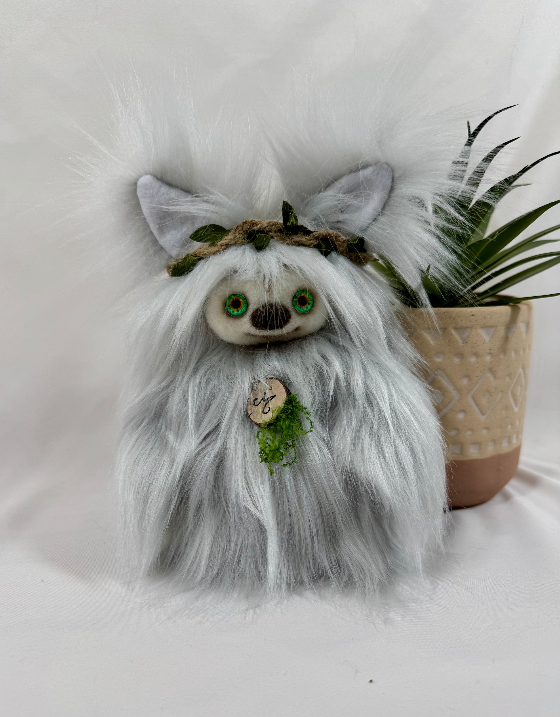 Son regard lumineux et sa couronne tressée de petites feuilles lui donnent une allure sage et bienveillante, comme un gardien silencieux de la forêt. 🌿✨
