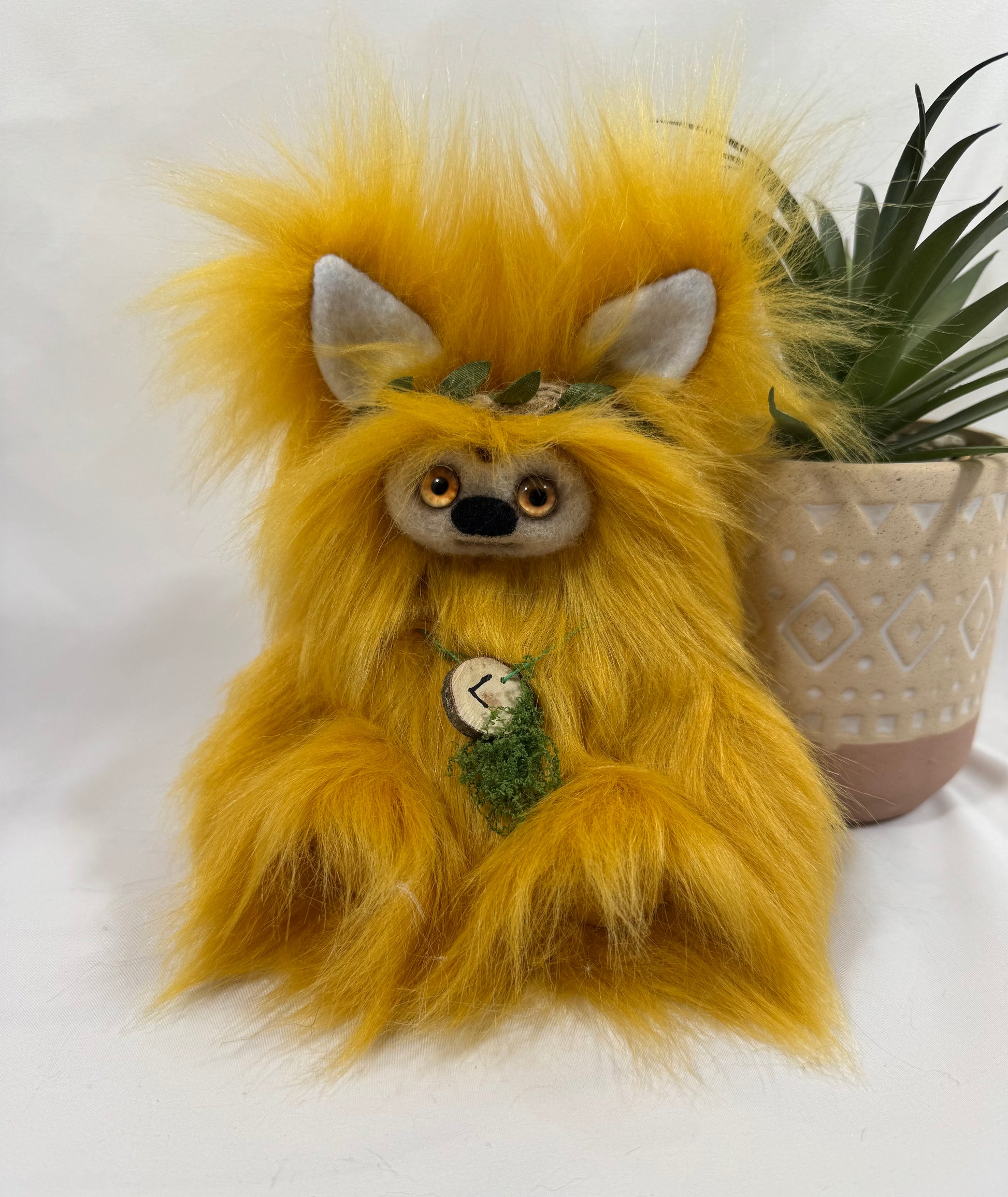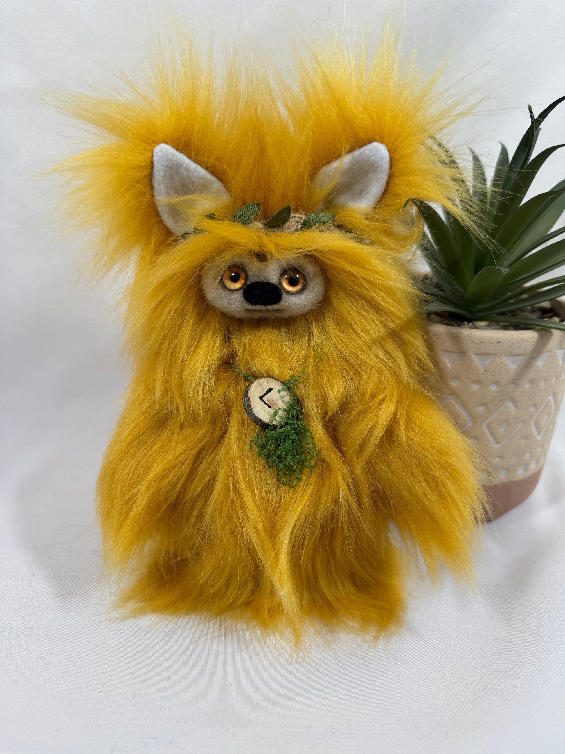 Sa couronne et son collier ornés de mousse décorative symbolisent son lien profond avec la forêt dorée. 🌿