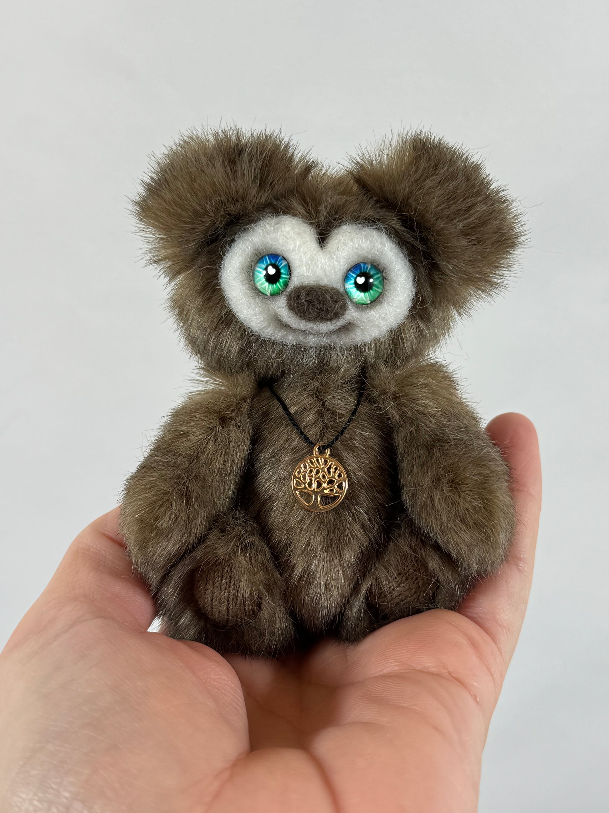 🧸 Elyo – Baby Frimousse miniature articulée en fausse fourrure marron aux yeux verts et touches de bleu | Collection Les Baby Frimousses