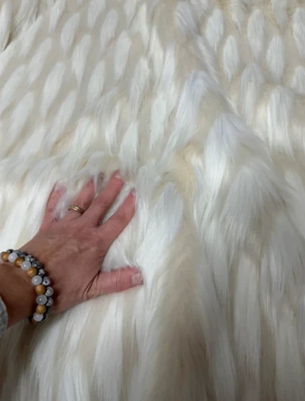 Magnifique fausse fourrure blanche et crème, lumineuse et douce, avec un poil long et soyeux qui apporte du volume et une belle élégance.