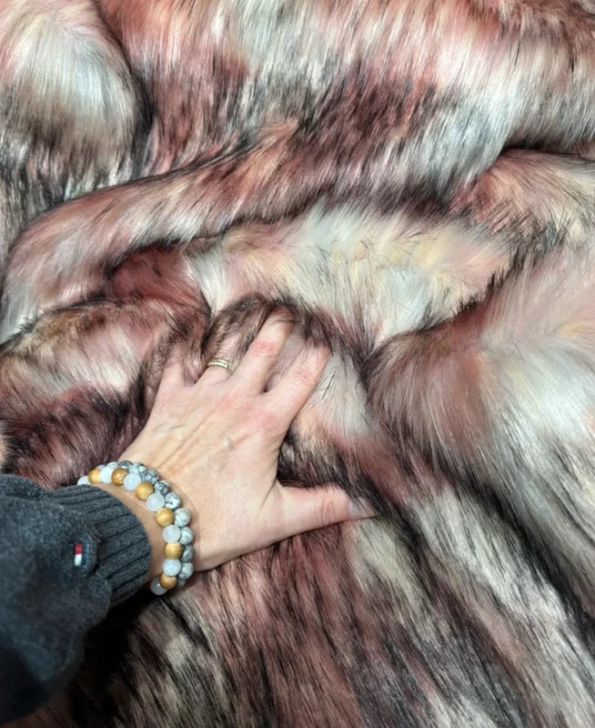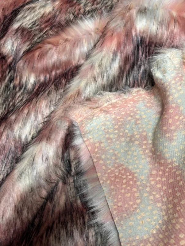 Belle fausse fourrure aux nuances de rose, beige et touches plus foncées, offrant un rendu chaleureux et original.