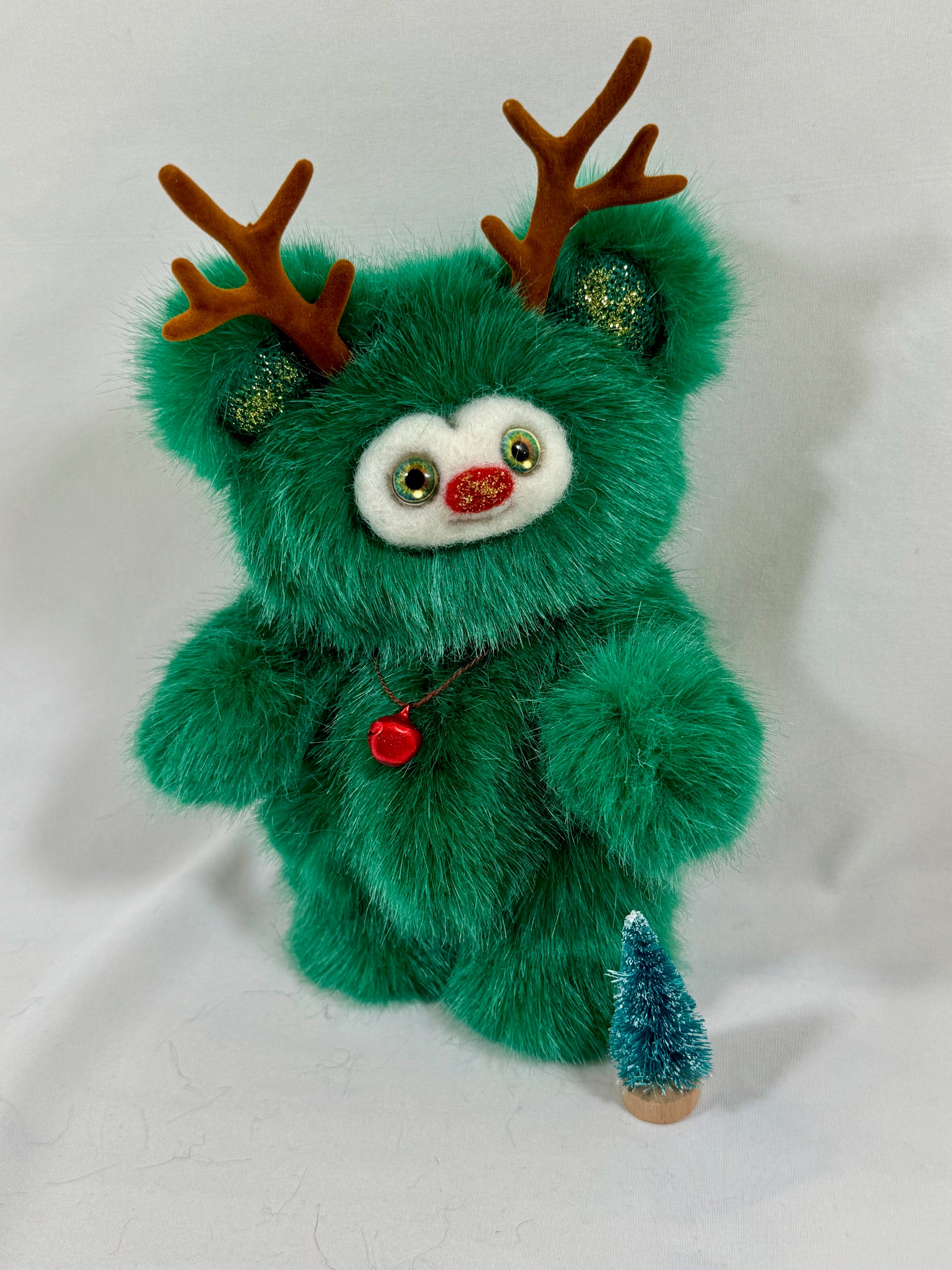 Son visage feutré à l’aiguille, ses yeux en verre et ses petits bois de renne lui donnent une expression vivante et attachante.