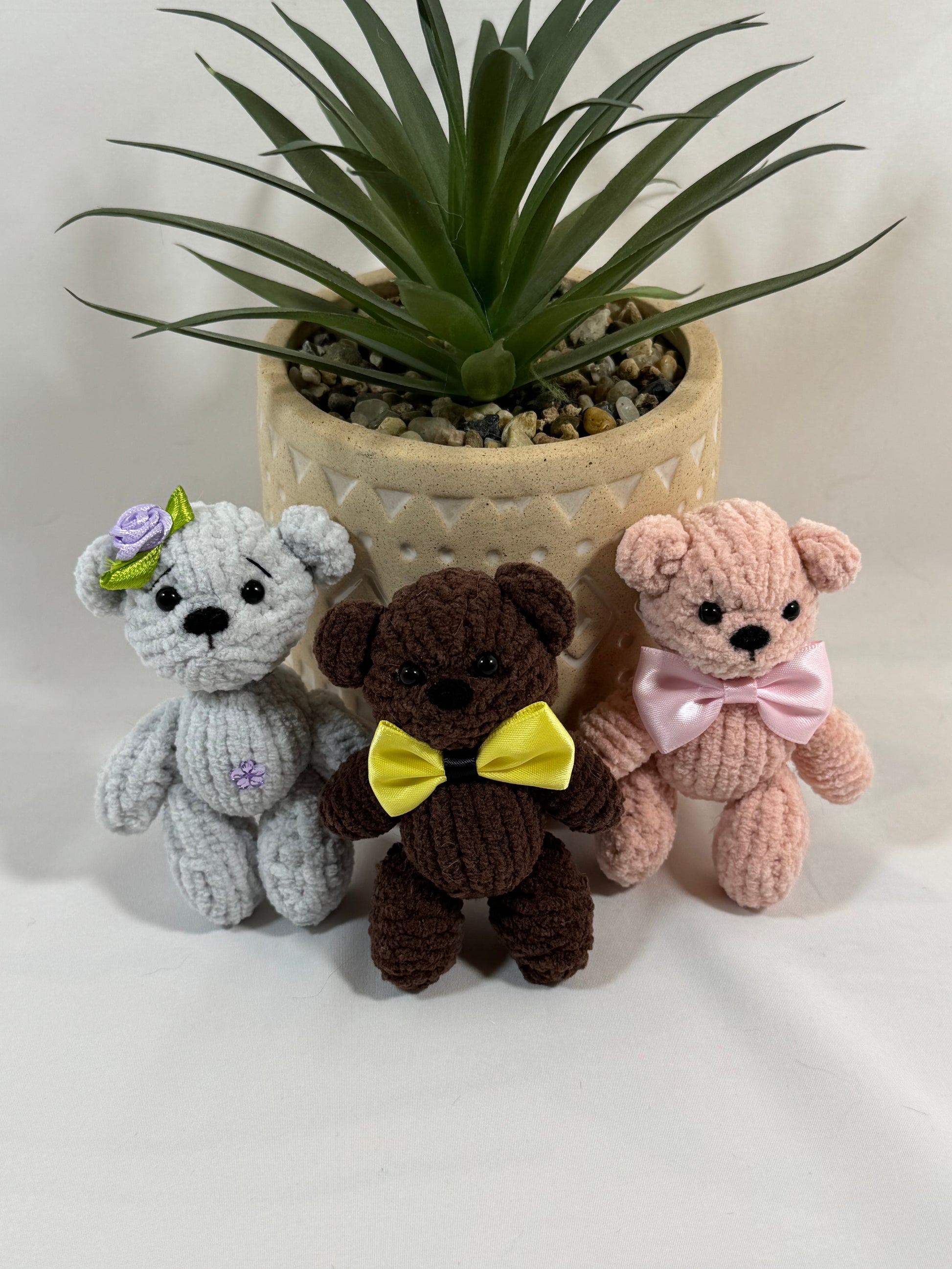 Découvrez nos adorables ours miniatures faits main au tricot, réalisés avec un doux fil chenille.