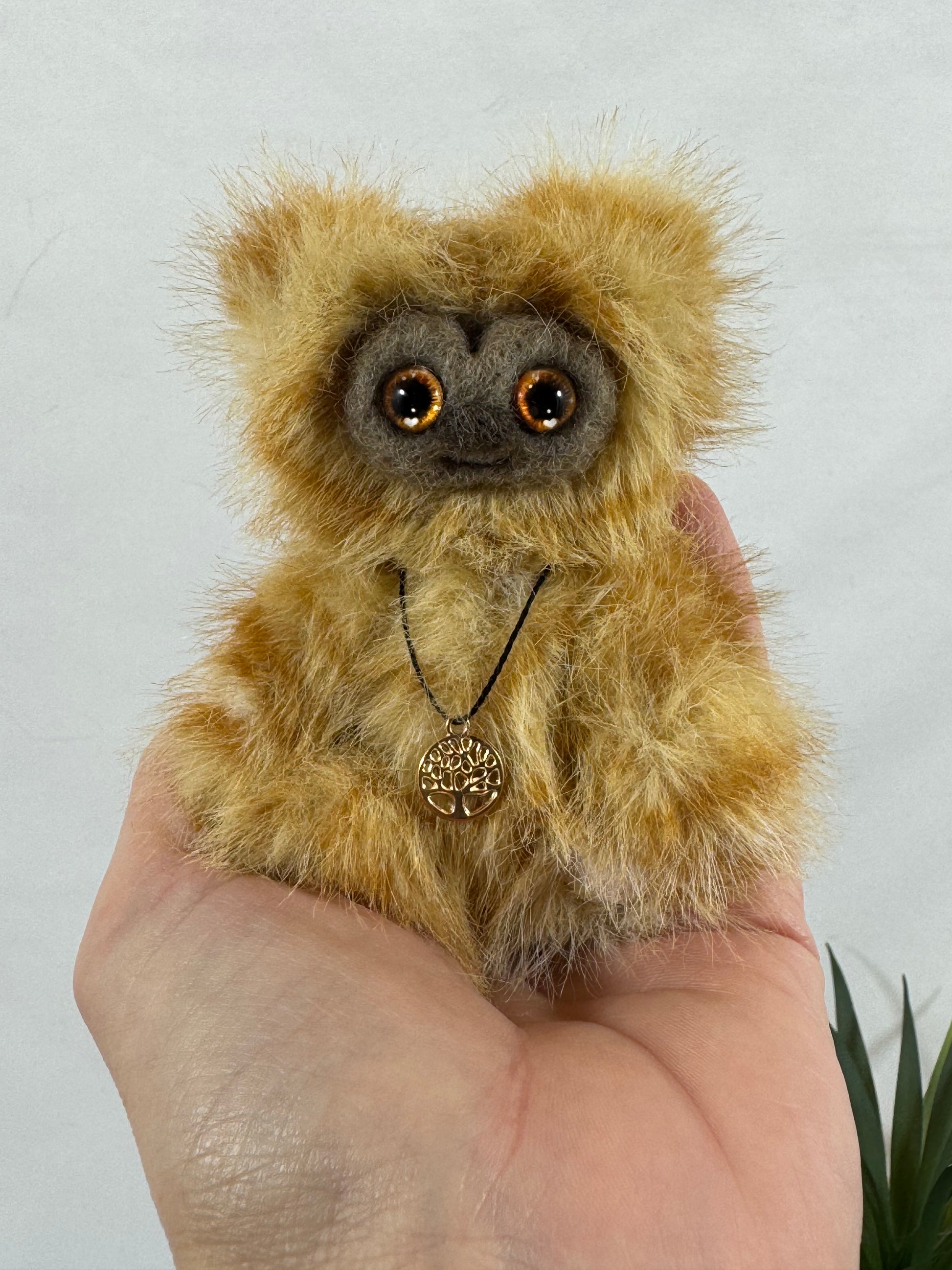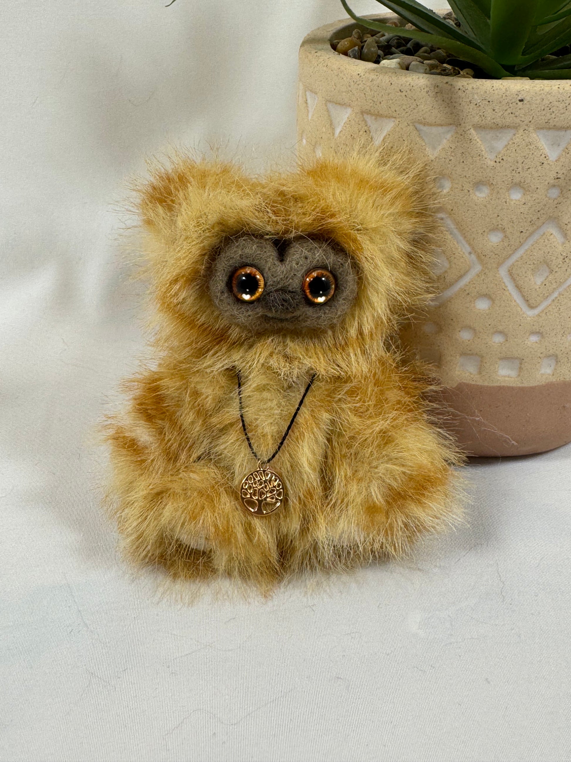 Cette miniature articulée d’environ 10 cm a été entièrement réalisée à la main dans une fausse fourrure caramel/dorée et soyeuse, qui reflète la lumière avec douceur.
