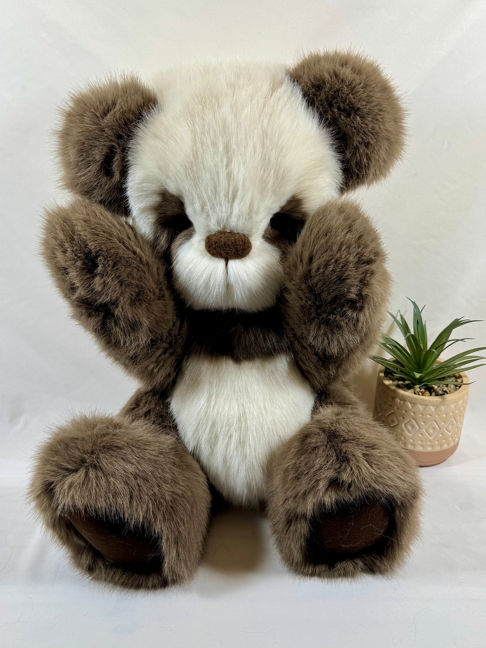 Balou – Panda de collection articulé 65 cm en fausse fourrure marron taupe et blanc crème