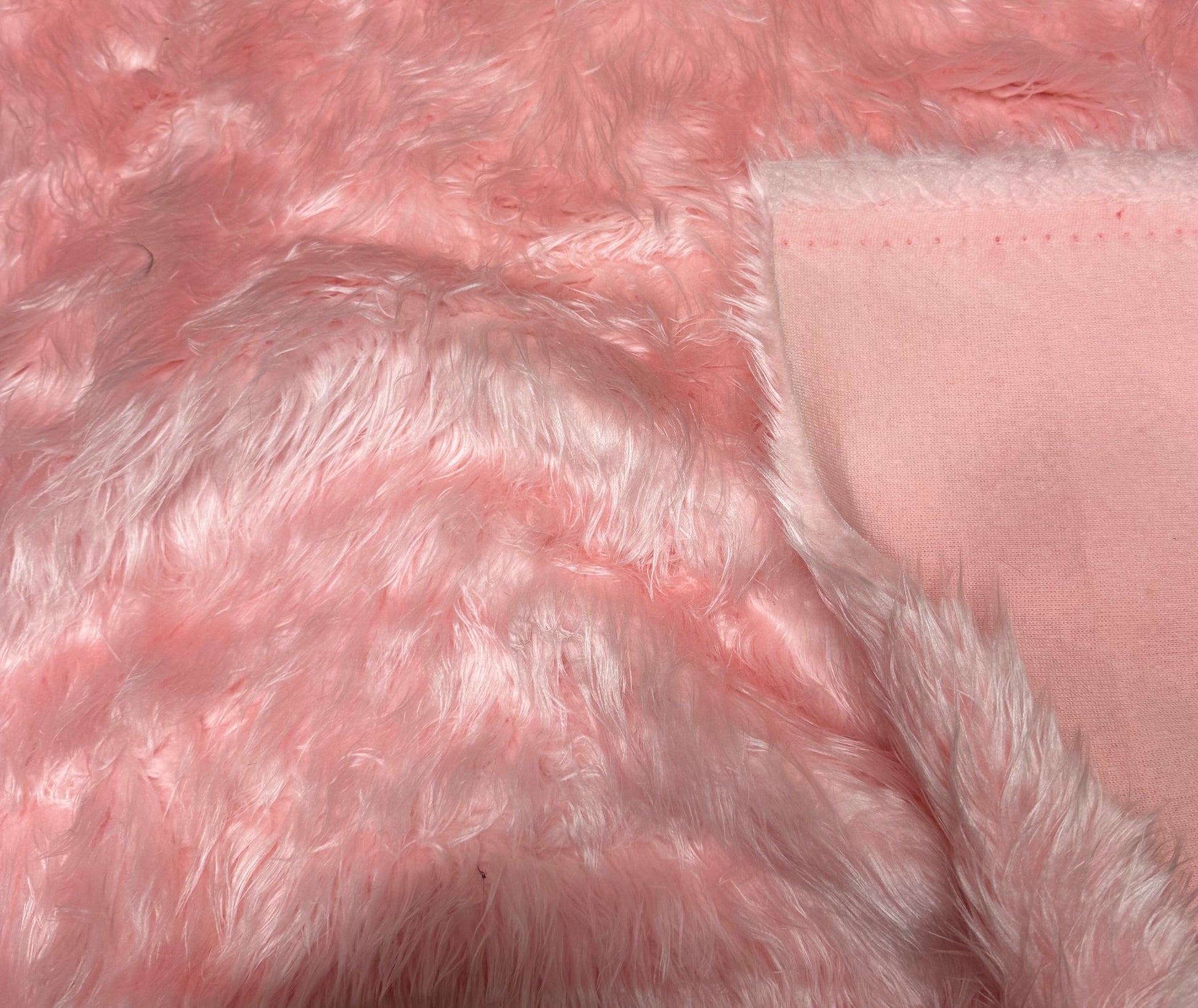 coupon de fausse fourrure rose très douce, avec de beaux poils longs d’environ 3 cm donnant un effet volumineux et moelleux.