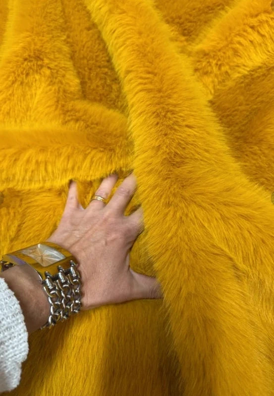 Coupon tissu fausse fourrure douce, épaisse à poils longs jaune moutarde miel 33cm x145cm