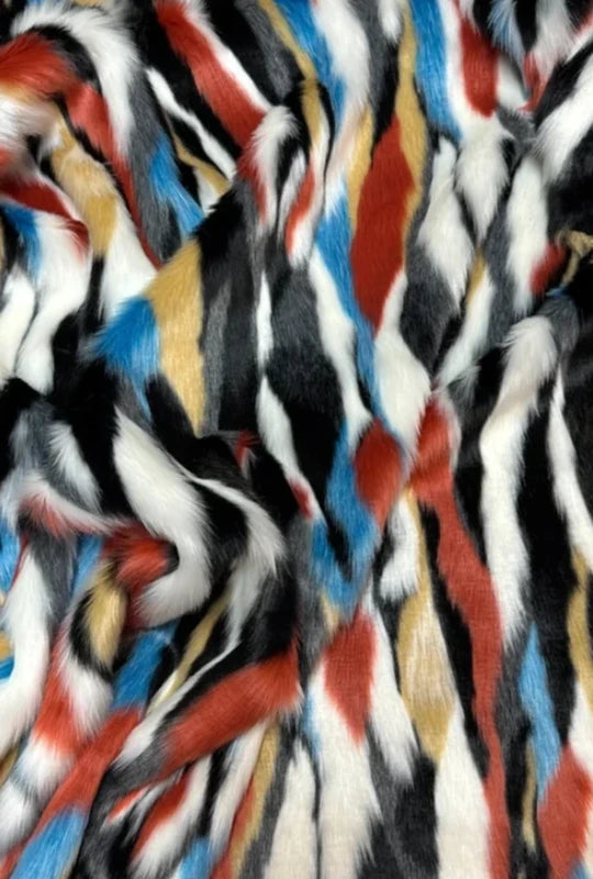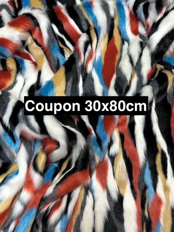 Coupon tissu fausse fourrure originale multicolore à poils mi-longs 30cm x 80cm