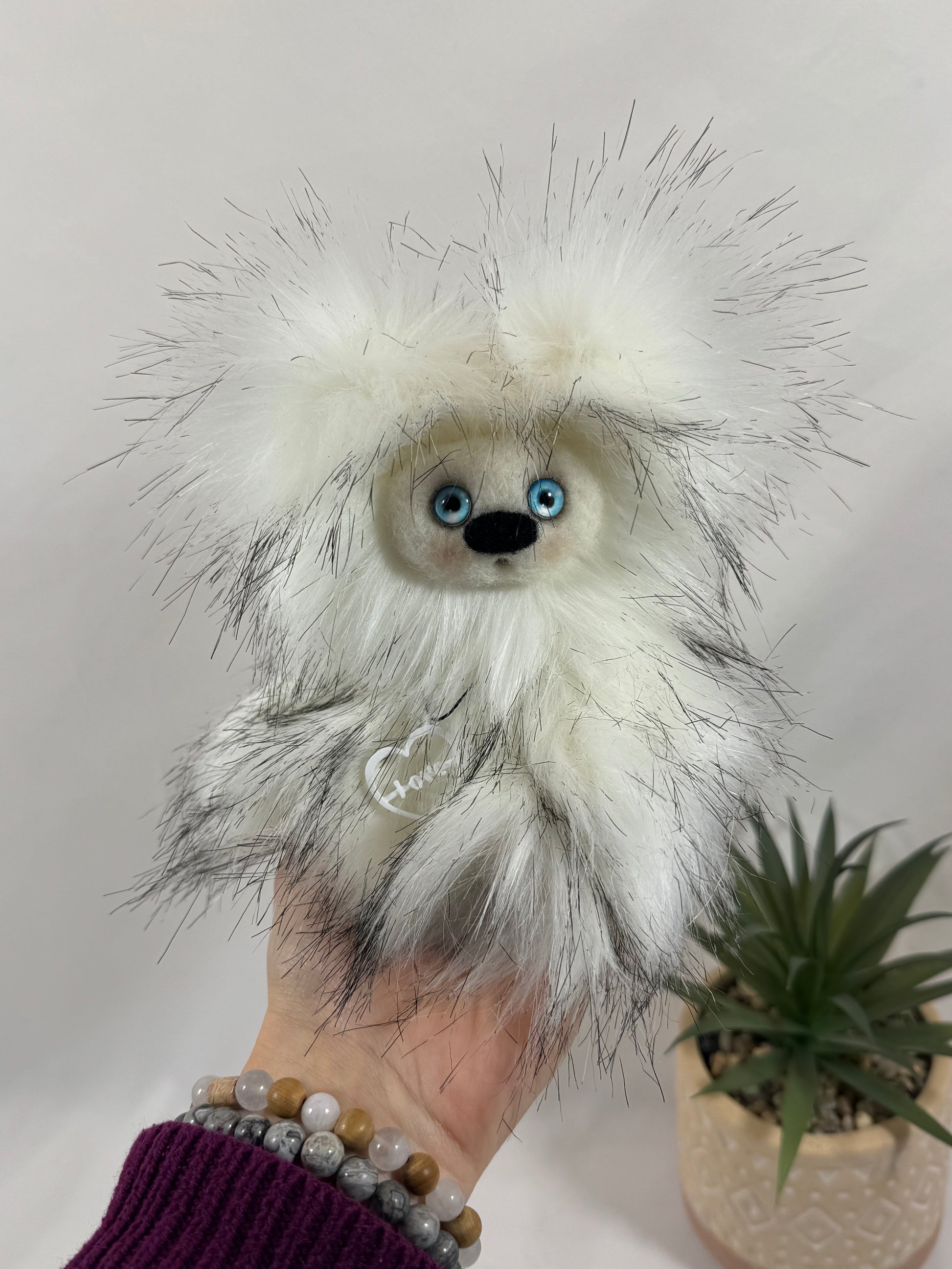 Il est réalisé en fausse fourrure blanche et grisée, aux reflets délicats, avec un toucher aérien et doux. Sa bouille feutrée, façonnée à la main, lui donne une expression calme, presque silencieuse ✨